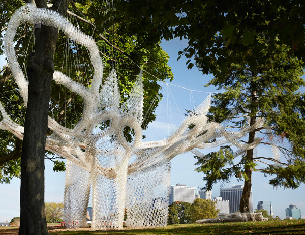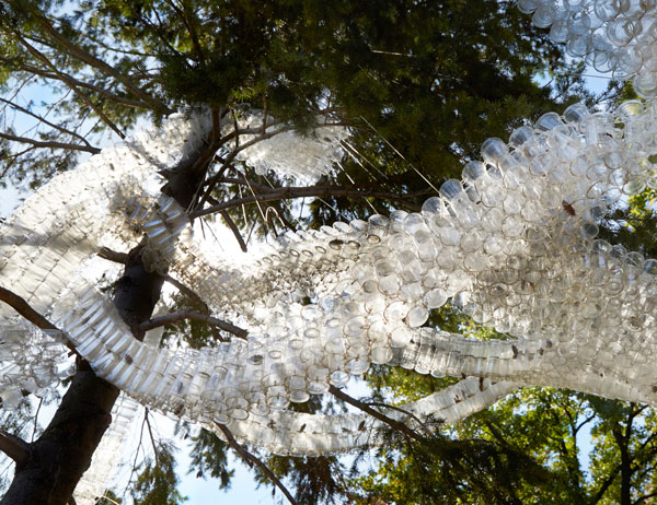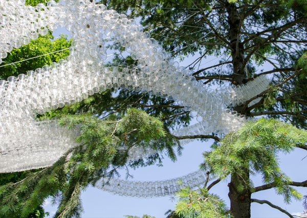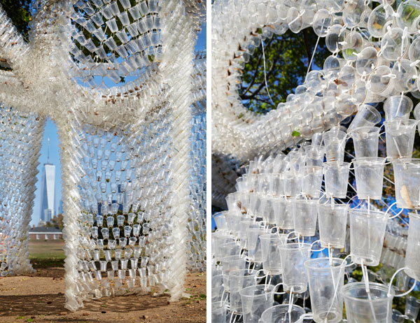 The result of this far-reaching teamwork was an innovative pavilion located in one of New York’s most unique public spaces. The tape-beam loops wrapped in, through and around trees to form a serpentine canopy that was in-filled with lacy constellations of cups.  The passage of the sun over the day reflected in the lantern-like luminosity of different densities of the plastic pavilion.  Wind audibly filtered through the cups. Governor’s Cup Pavilion formed a place for gathering, interaction and performance.  It was a playground for children and adults.