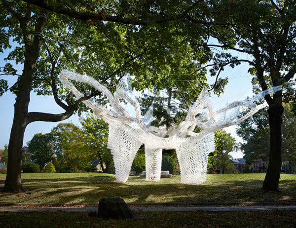 Inspired by the structural strategies of tape-lace crochet techniques, CDR’s Governor’s Cup was a nod to the 100 billion cups that accumulate in landfills each year. In fabricating the Governor’s Cup, CDR Studio was able to bring together a robust design team, a troop of 100+ volunteers, and numerous other supporters to help bring their vision to reality. The team successfully diverted 30,000 plastic cups from New York City’s garbage stream, collected from venues throughout the city, then cleaned and reused. CDR Studio also managed to crowd-source more than $14,000 to help pay for the pavilion’s construction – a record for this five-year annual competition – and its volunteers were an integral part of every phase of the pavilion’s realization. Volunteers met in the CDR Studio twice a week, helping to drill holes in the recycled cups, glue them together, and create the modules that would eventually form the serpentine pieces of the pavilion. CDR received structural assistance from the Robert Silman Associates.