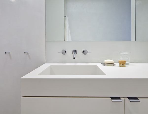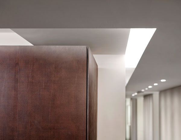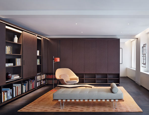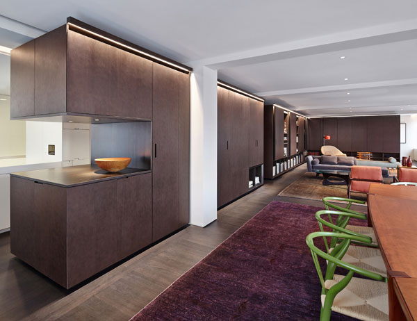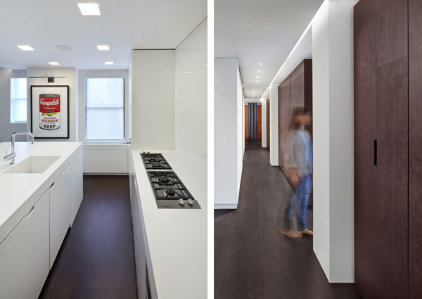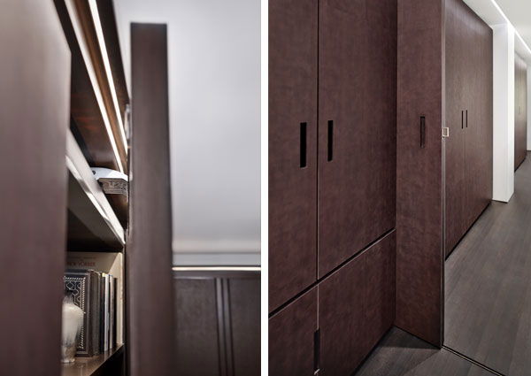 A flooring material was repurposed as distinctive cladding for the storage core itself. Originally divided by walls, the existing oak floors were joined together and refinished with a dark aniline dye, providing a subtle historical record of the original room layouts and their varied board patterns. All other walls, cabinets and perimeter surfaces in the surrounding rooms are white, constructed from flush Venetian plaster, high-gloss lacquer, back-painted glass and Corian.