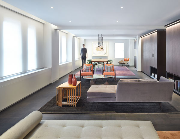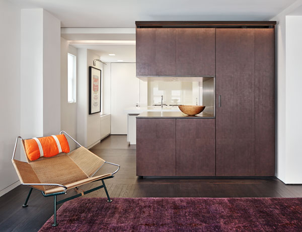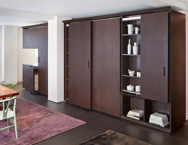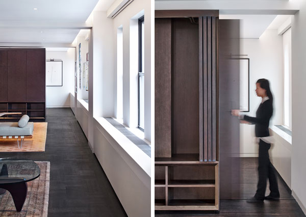 To respond to these requirements, all existing interior walls were stripped away during demolition, leaving an open and airy 2,500 square foot space, divided lengthwise by four original 1920s-era steel columns. A full-height storage core was inserted between these columns. The L-shaped core serves as both a spatial divider that delineates rooms, as well as an active element within each by providing display cabinets in living spaces, integrated appliances and work surfaces in the kitchen, equipment storage in the office and exercise area, and concealed pocket doors for privacy as needed.